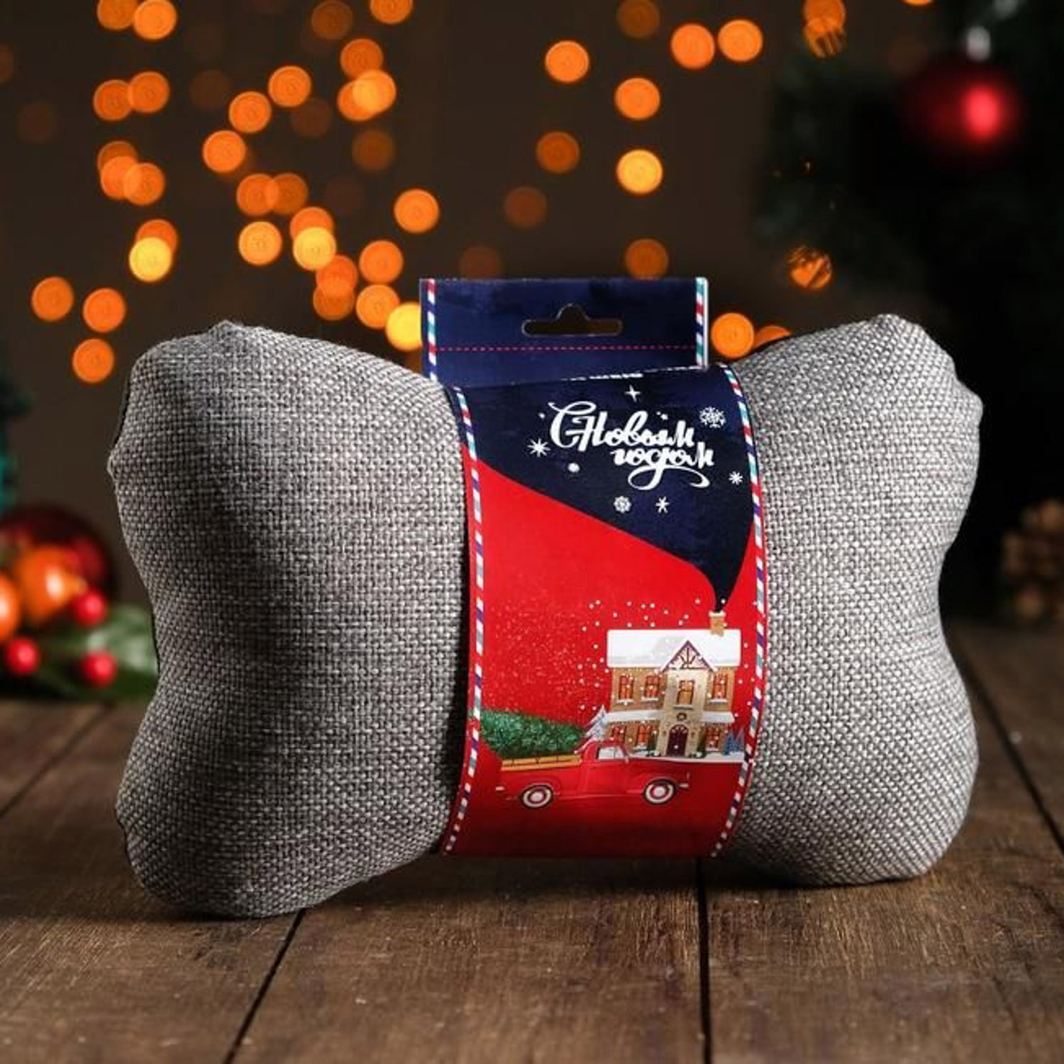 яяяПодушка автомобильная подарочная "Новый год", на подголовник, лен, серый, 18х26 см 5458982