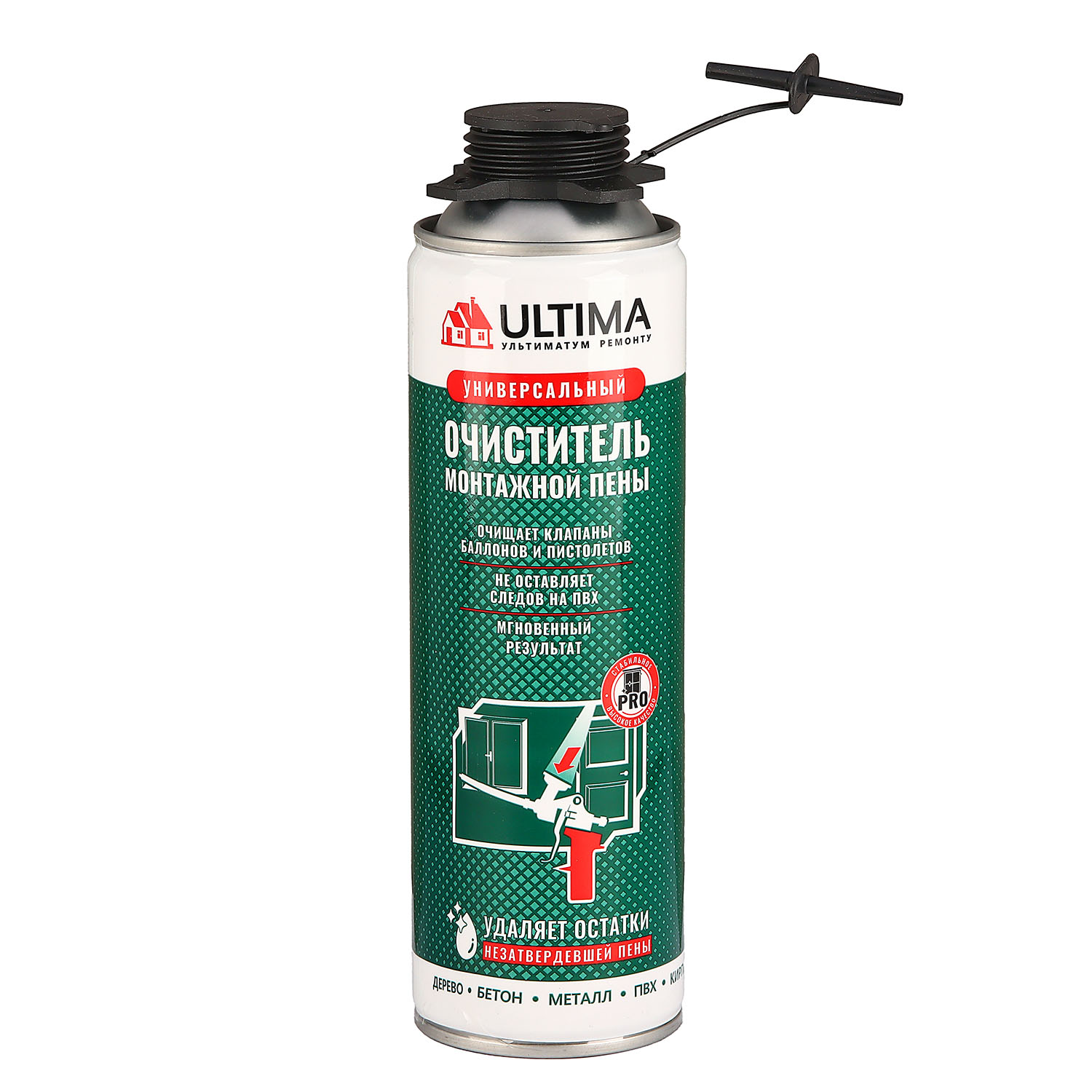Очиститель монтажной пены ULTIMA — аэрозольное универсальное средство для удаления незатвердевшей монтажной пены, напыляемого утеплителя, полиуретанового клея, герметика и клея с металлических, пластиковых и других непористых поверхностей, очистки кожи, промывки монтажного пистолета после работы, очищения корпуса и ствола пистолета. Подходит для обезжиривания стеклянных и металлических поверхностей перед нанесением герметика или полиуретана. Не оставляет следов на ПВХ поверхностях.