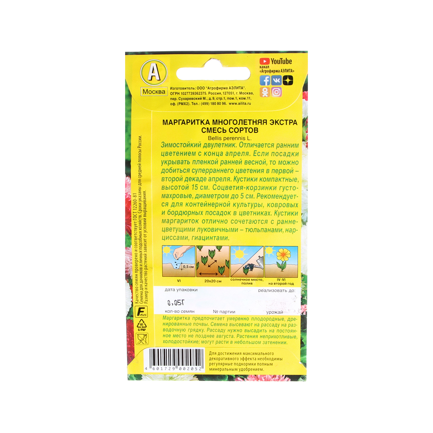 Семена Маргаритка Экстра смесь 0,05гр Аэлита цв *10/200