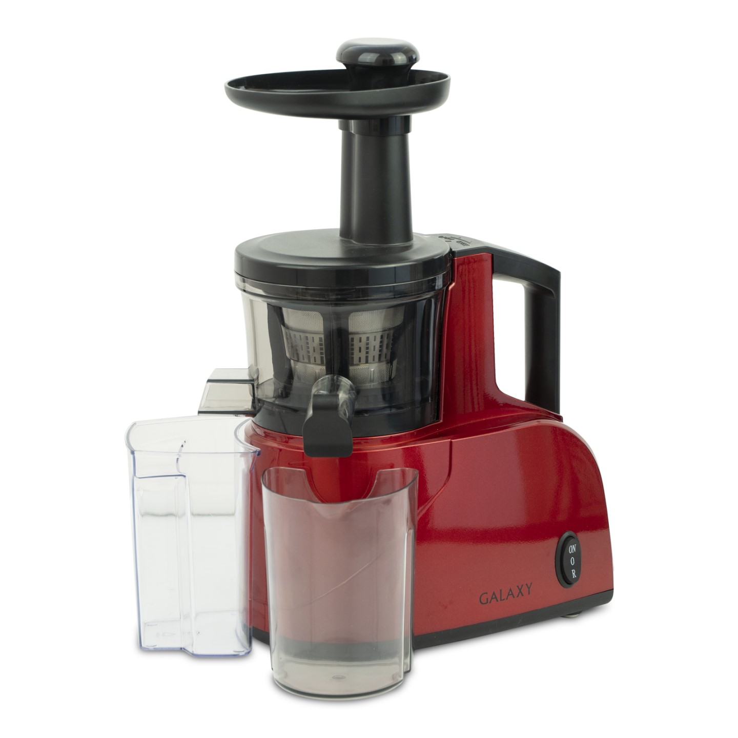 Шнековая соковыжималка GALAXY LINE GL0800 с прессовой технологией отжима, низким уровнем шума и большим контейнером для сока.