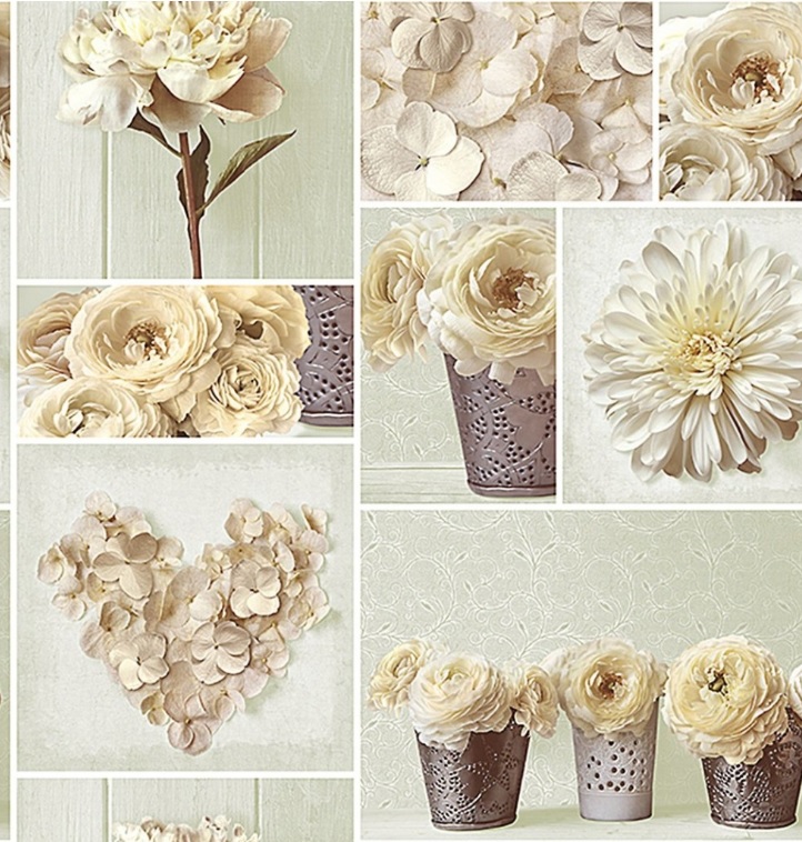 яяяКлеёнка на нетканой основе "Мажор" "Коллаж: кремов. цветы" на св.зел. ш.1,35м 572/3 "Колорит" *20