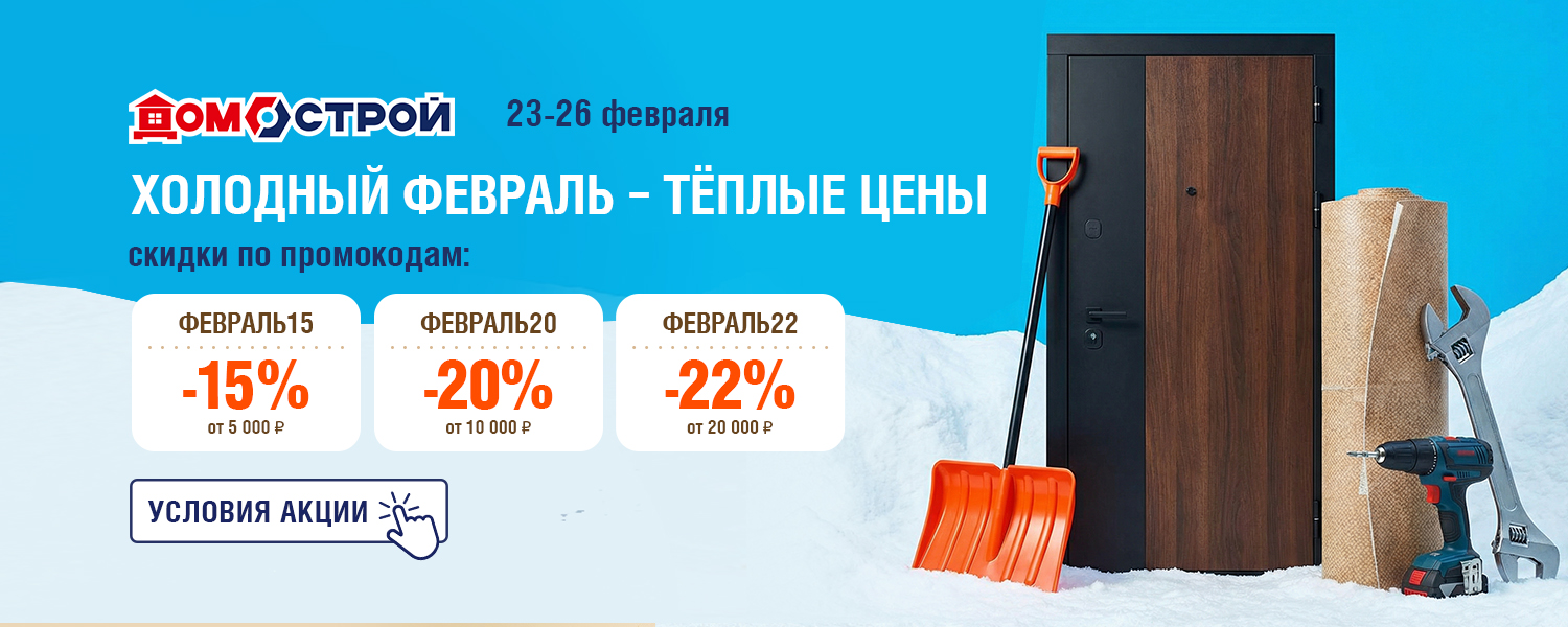 Весна вот-вот постучится в дверь и самое время заняться домом. А у нас холодный февраль превращается в тёплые цены на сайте domostroy.shop с 23 по 26 февраля! Чем выше сумма покупки, тем больше скидка: